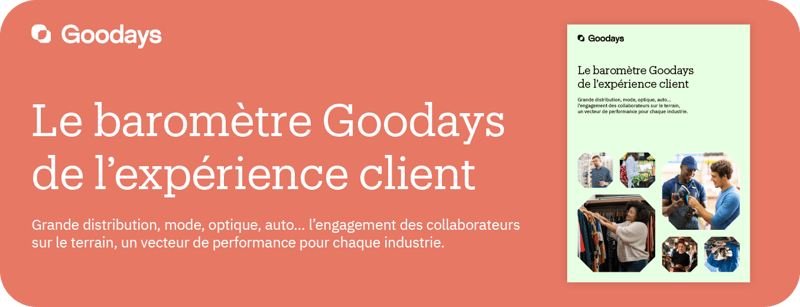 Chez Goodays, nous sommes convaincus depuis toujours que ce sont les équipes locales qui détiennent les clés de l’expérience client. C’est pourquoi les entreprises du retail ont tout intérêt à leur confier la gestion de la satisfaction client. Comment ? C’est ce que dévoile notre dernier Baromètre de l'Expérience Client, qui met en lumière les bonnes pratiques de nos clients issus des secteurs de la mode et de la beauté, de l’optique, de l’automobile et de la grande distribution, avec de nombreux chiffres à l’appui.