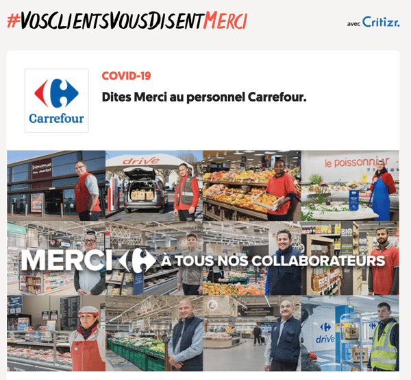 Au cours de ces derniers mois difficiles pour le retail, nous nous sommes attachés à soutenir nos clients existants en tant que partenaire de confiance. Nous avons travaillé avec Carrefour et créé un site web autonome permettant de recueillir des messages de remerciement à destination des équipes locales via notre initiative #Vosclientsvousdisentmerci.
